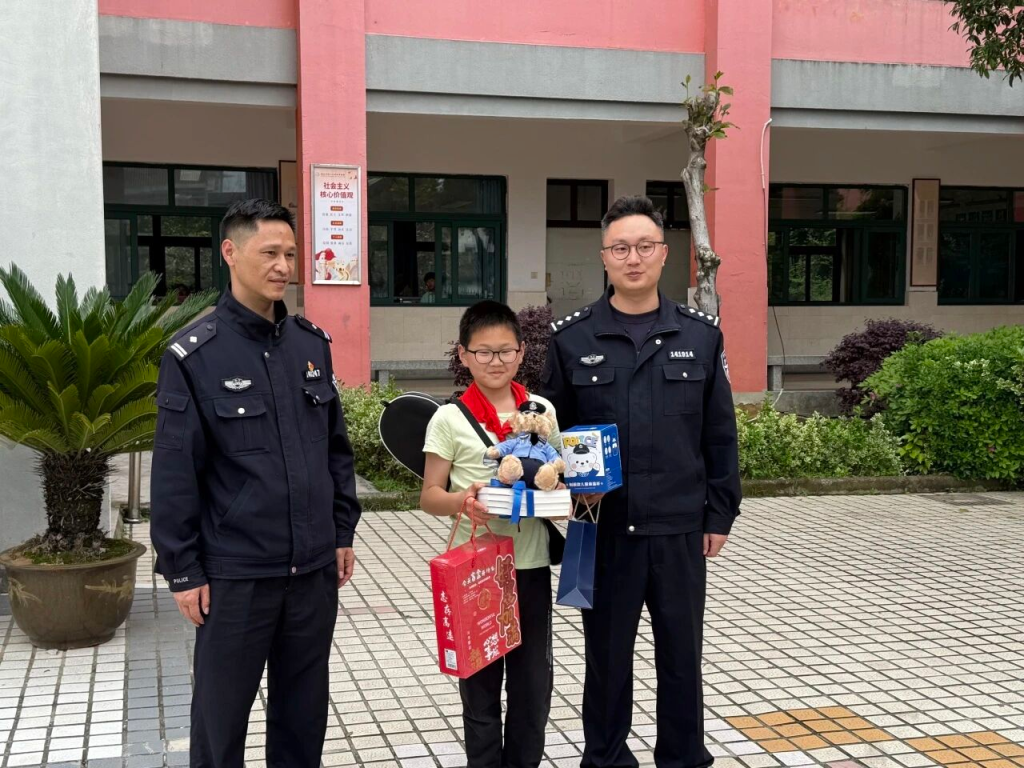 黄子轩今年12岁,就读于树人小学南校区六年级。为表扬他热心助人的行为,4月16日中午,越城公安分局基层基础管理大队与鉴湖派出所一道专程来到校园内,为遇事临危不乱的黄子轩当面颁发“安全小使者”特别奖状,并赠送了警熊和礼品。
